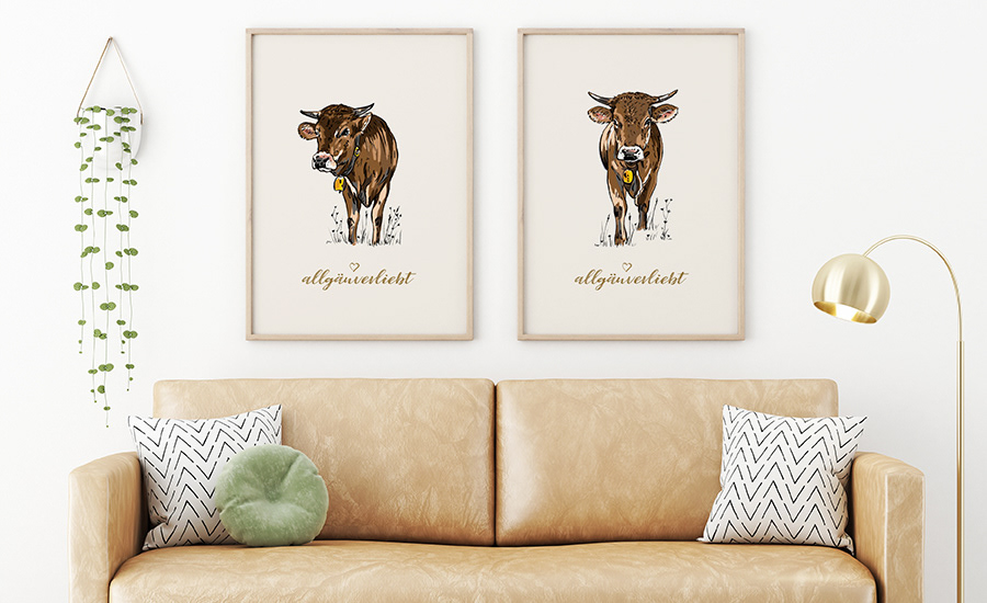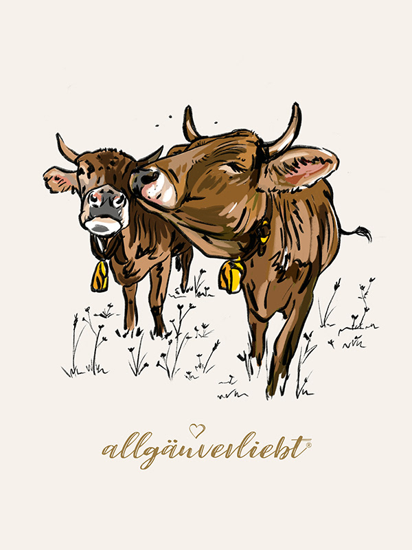 Hier seht Ihr eine kleine Auswahl meiner Kuh-Illustrationen vom schönen Allgäuer Braunvieh.